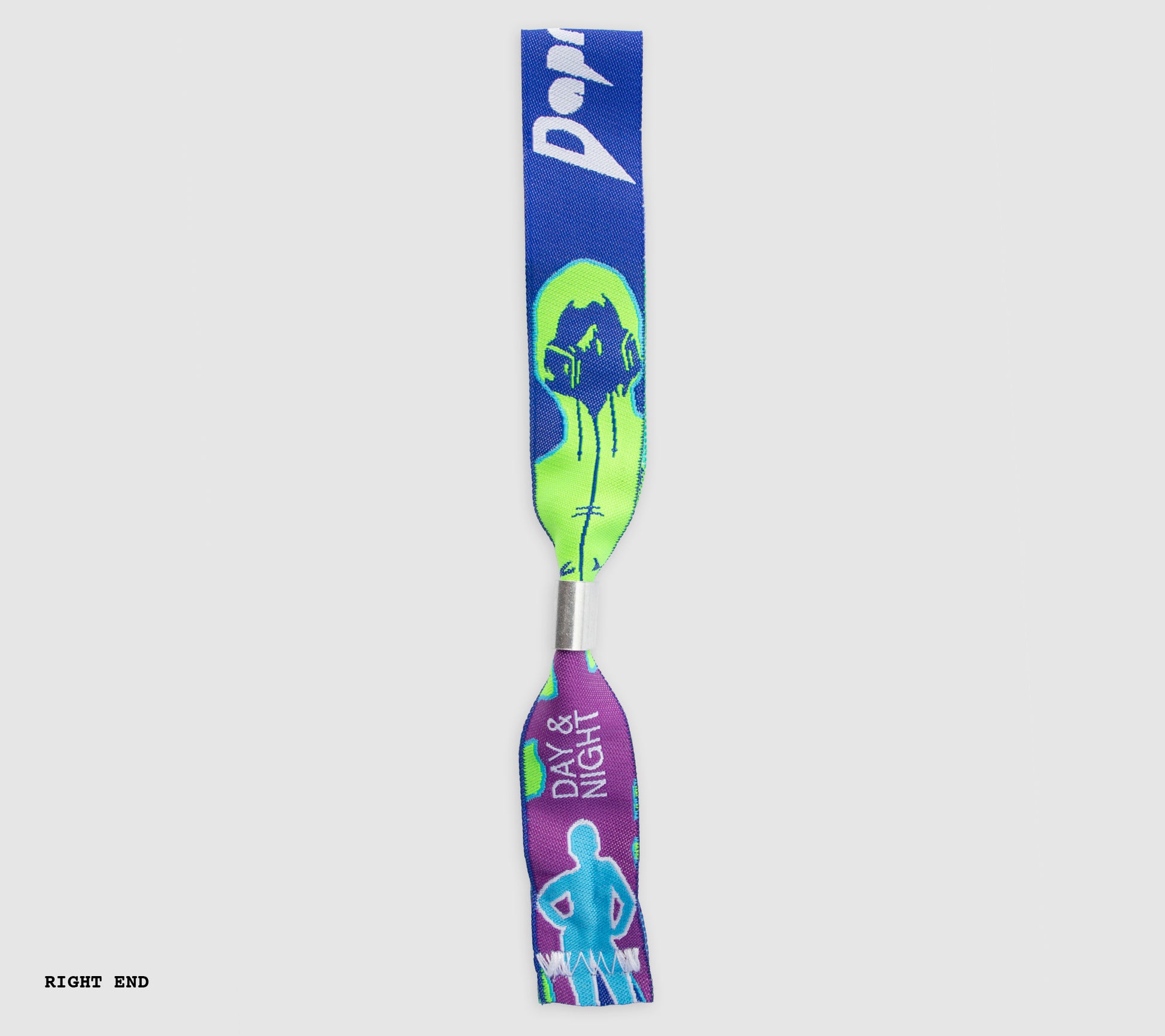 Day & Night Wristband is a premium woven bracelet with a Dela graphic in neon threading. Adjustable aluminum closure. 20 mm width.