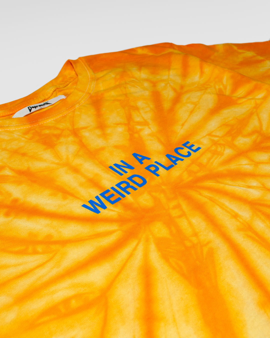 In A Weird Place trademark screen printed on the front of a short sleeve t-shirt. Each tie-dye is unique. Crewneck collar. Standard fit.