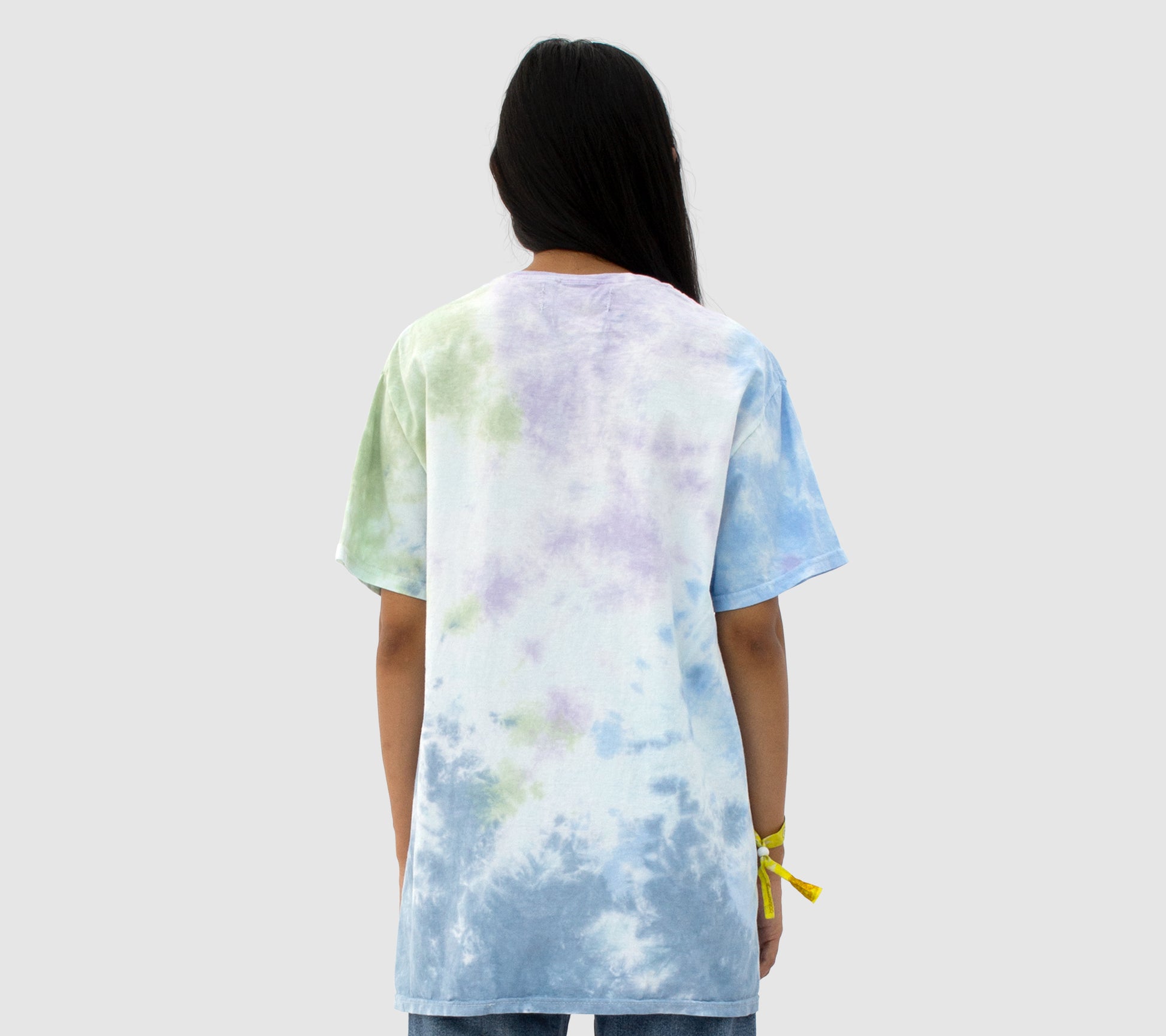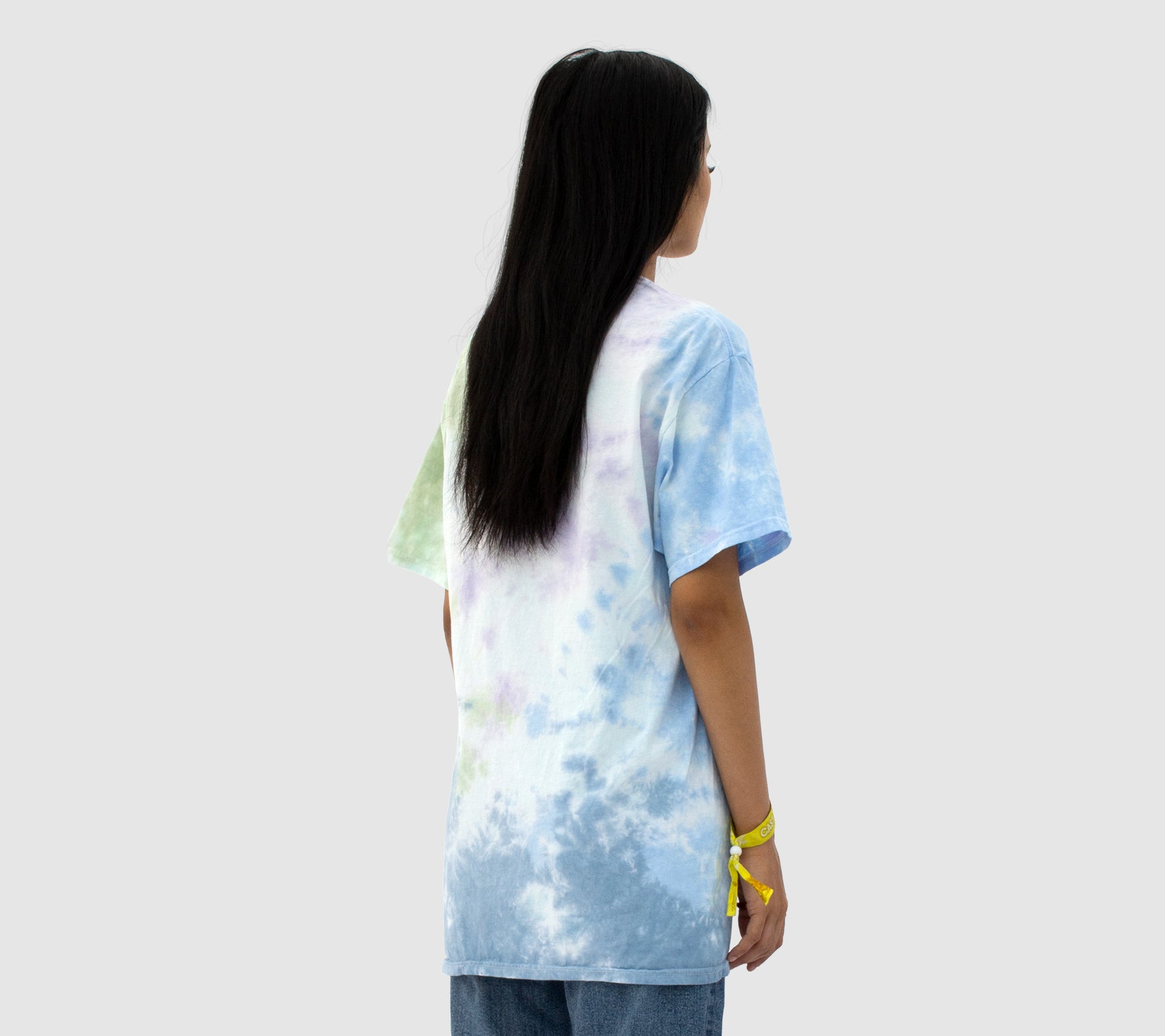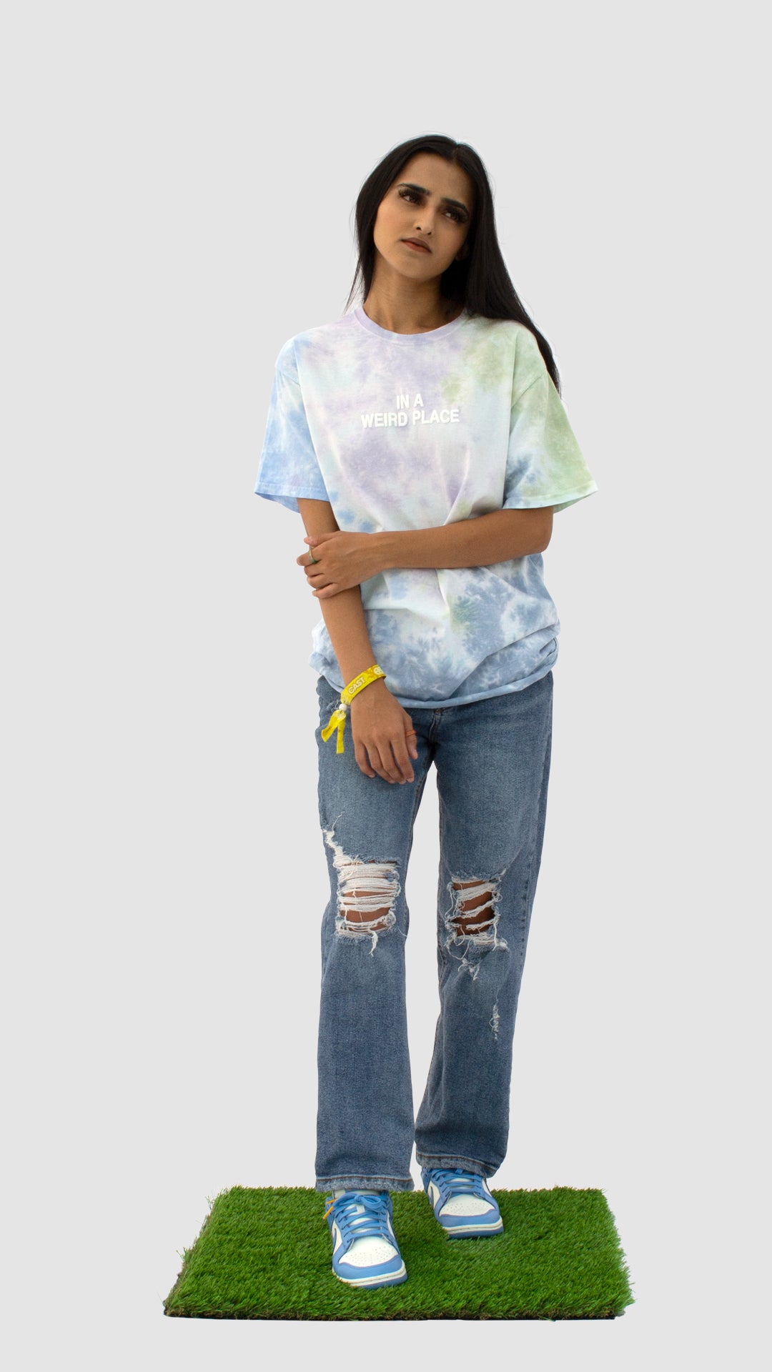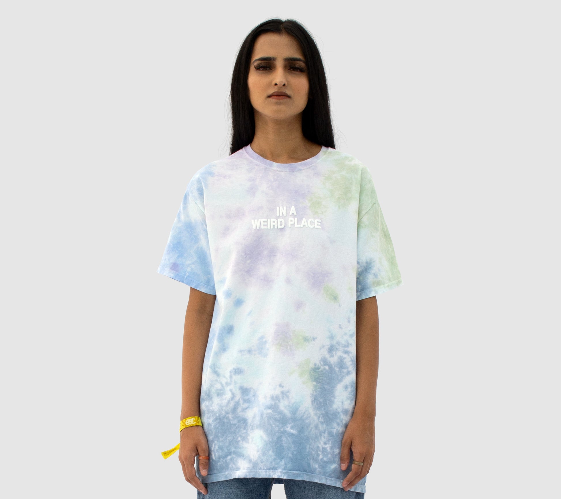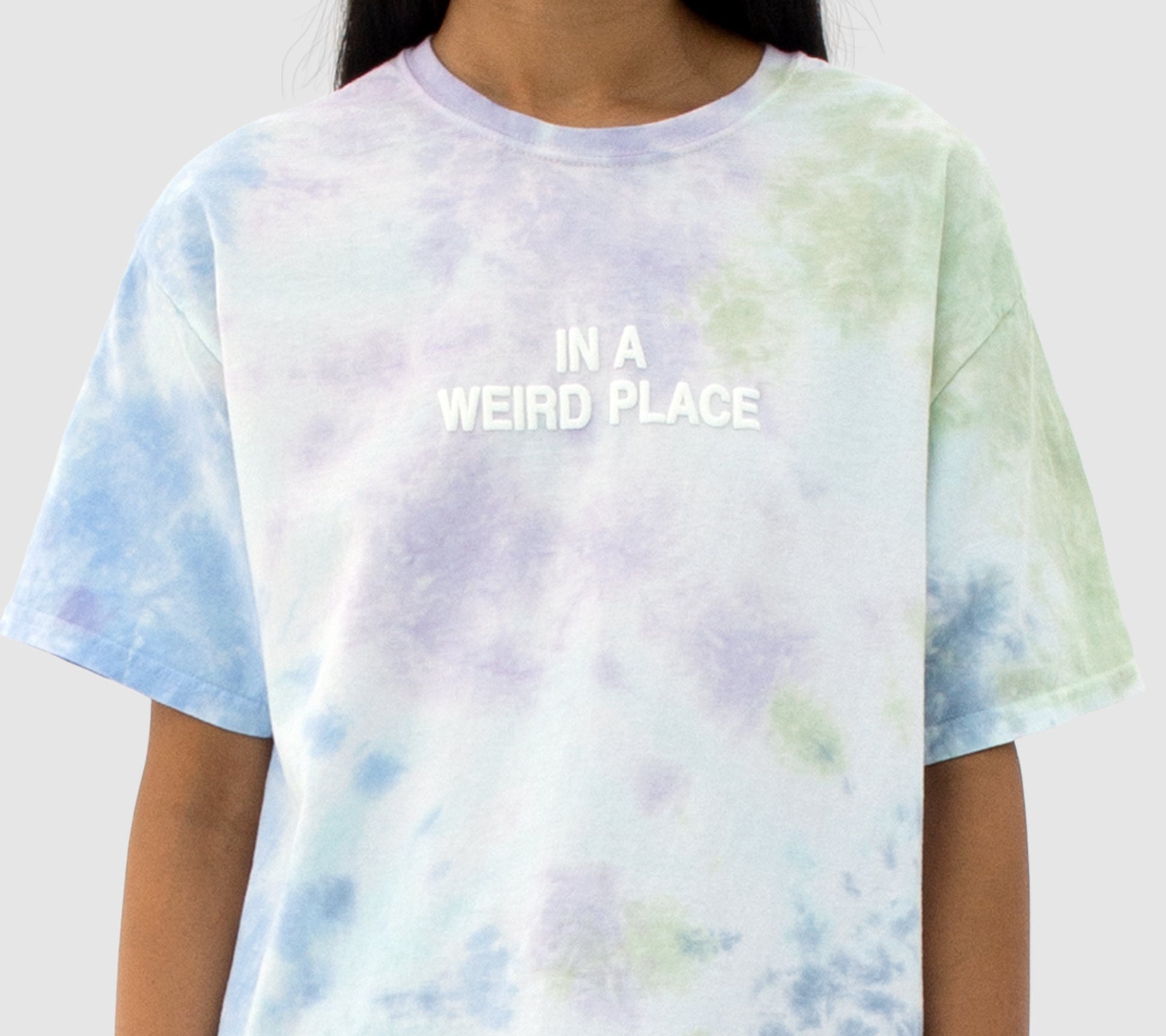 In A Weird Place trademark screen printed with puff ink on the front of a short sleeve t-shirt. Each tie-dye is unique. Crewneck collar. Standard fit.