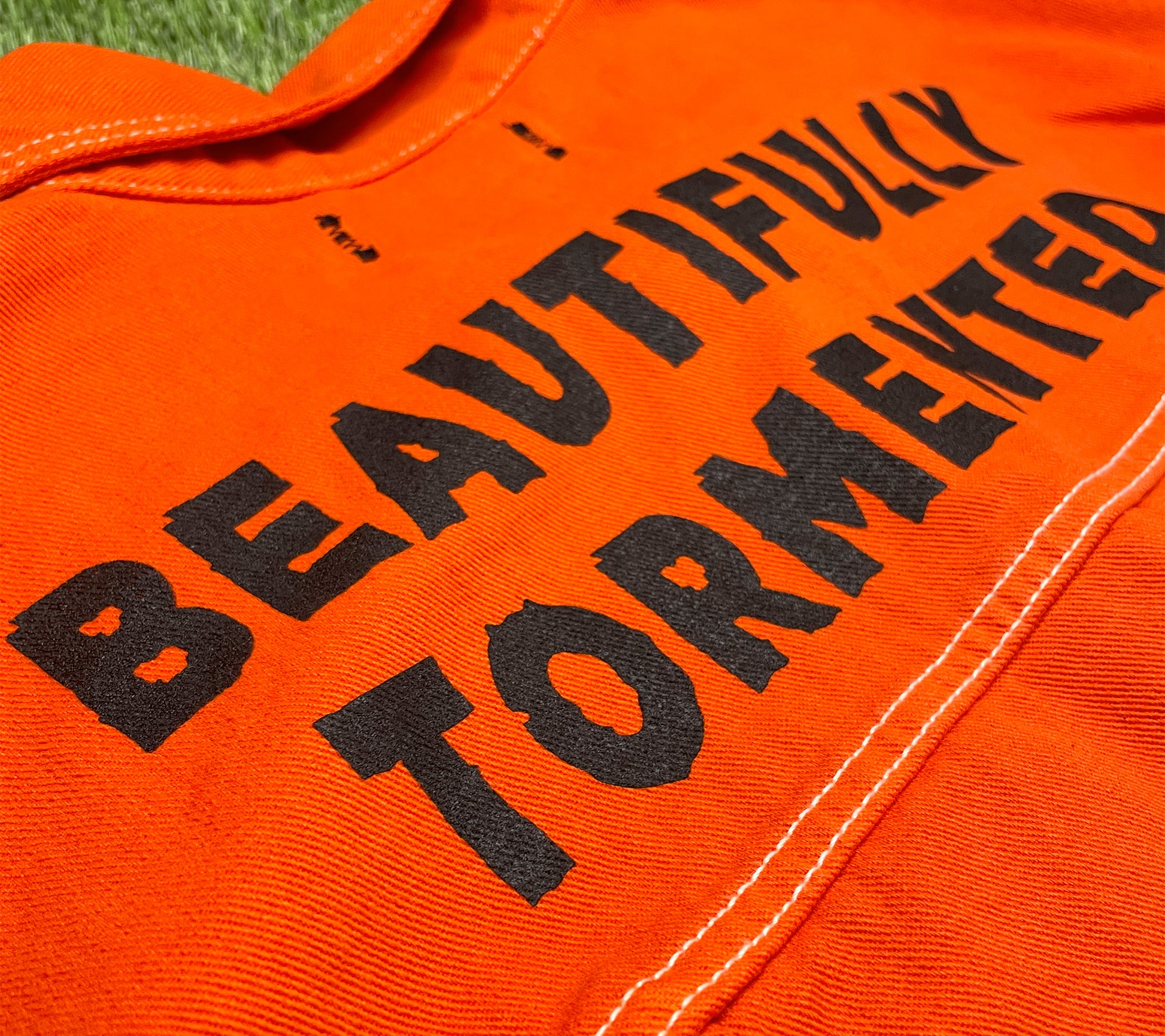 Nightmares Cropped Jacket is a 1/1 cropped jacket with a collar. Custom dyed jacket with hand painted buttons. Screen printed graphic on the front and the back. Flap chest pockets with buttons. Oversized fit.